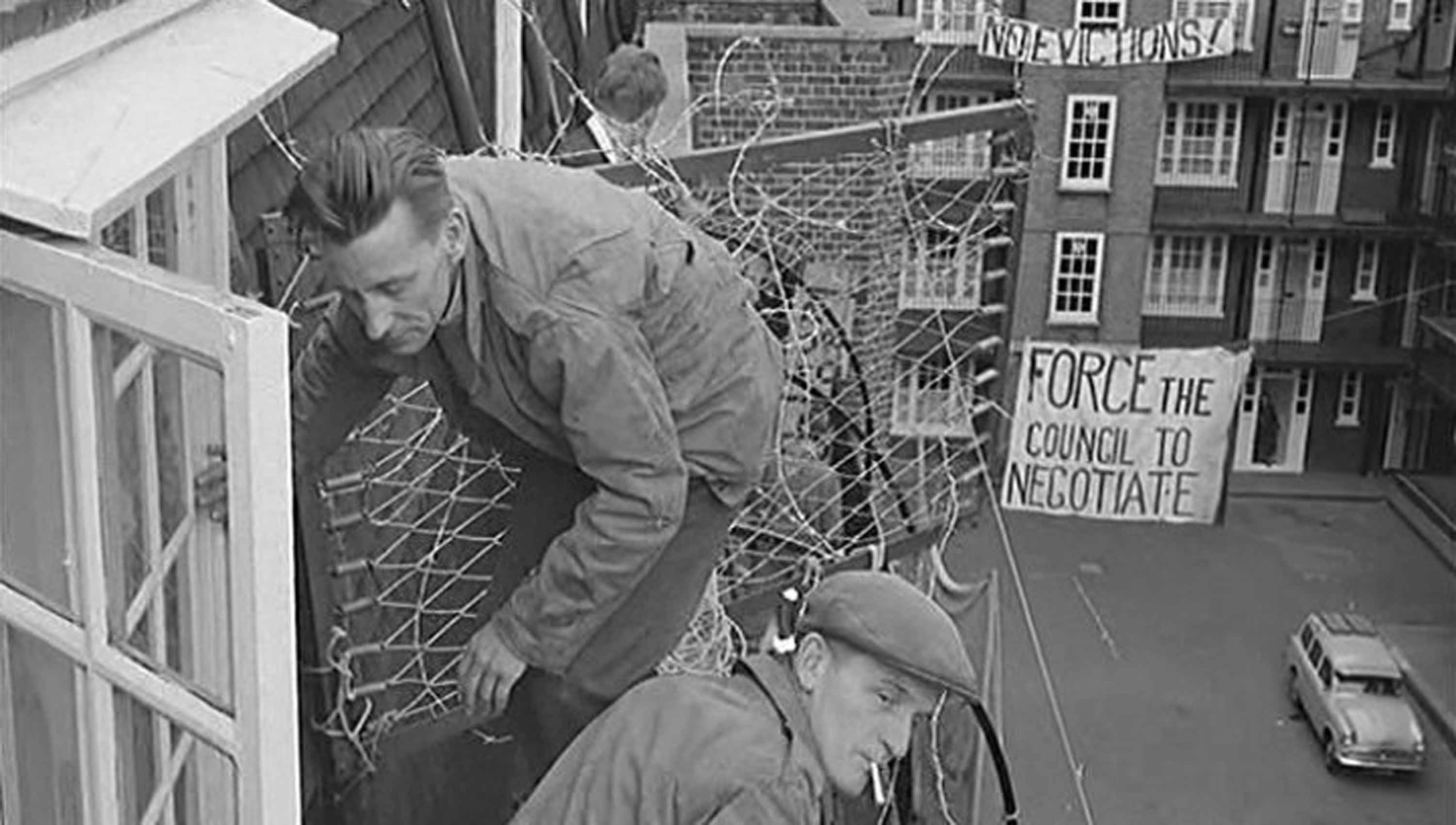 Tenants barricade flats against eviction during St Pancras Rent Strike, 1960.